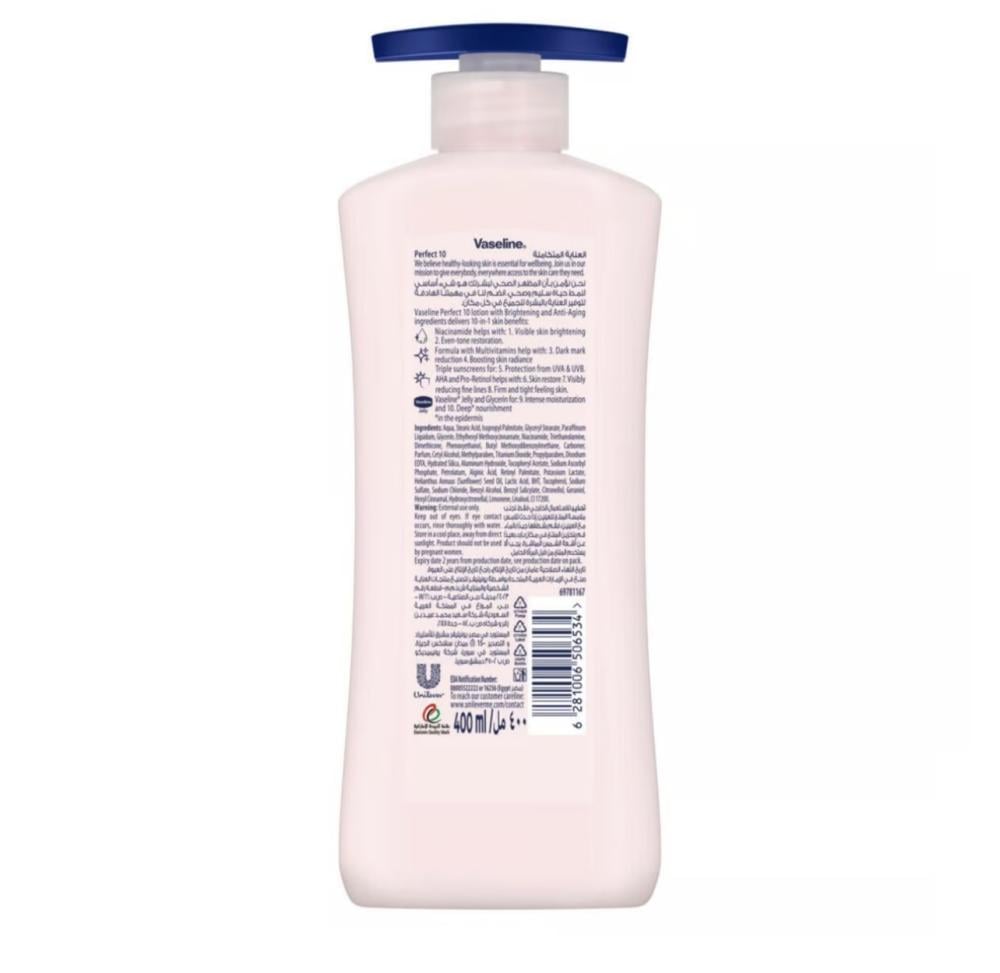 فازلين لوشن اللون الموحد الأساسي بيرفكت 10 هو منتج مصمم لتوحيد لون البشرة وتحسين مظهرها بشكل عام. يحتوي على مكونات مغذية ومرطبة تساعد في الحفاظ على بشرة صحية وناعمة. يأتي بتركيبة خفيفة وسهلة الامتصاص، مما يجعله مناسبًا للاستخدام اليومي.